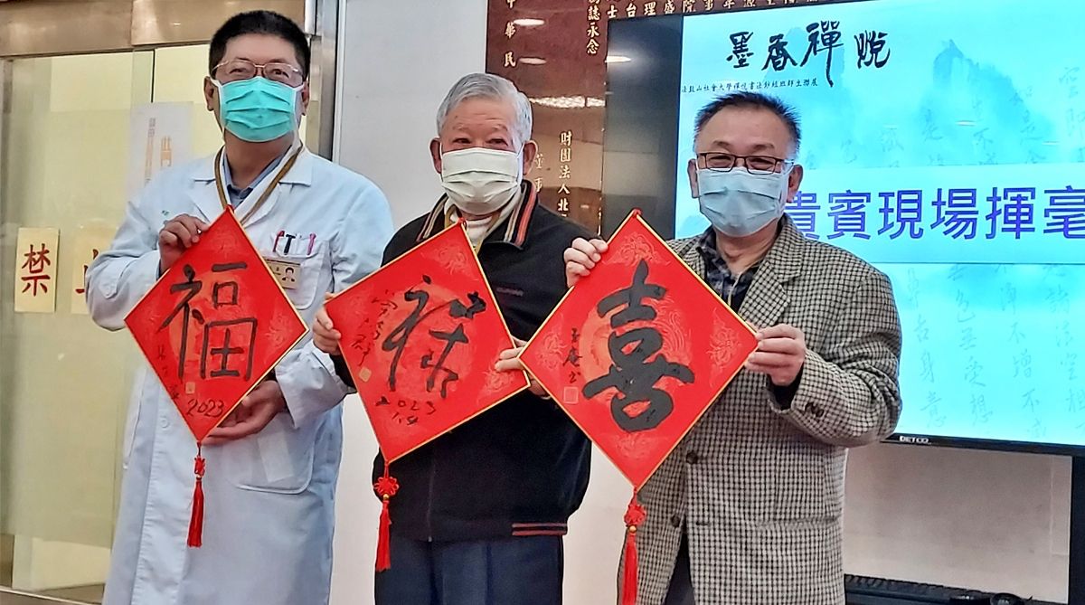 會中,還由曾濟群校長、張志豪院長及林欽商老師,共同揮毫「福」、「祿」、「喜」三字並落款及用印,給予金山分院拍賣,所得將用於偏鄉醫院醫療,也藉此祝福民眾新年大吉大利。3位貴賓揮毫時,吸引許多與會民眾拍照留下珍貴畫面,也讓醫院充滿墨香和歡喜又溫馨的氣息。現場還有「寫春聯送祝福」活動,同時,林老師也親自為貴賓、民眾及與會人員導覽。