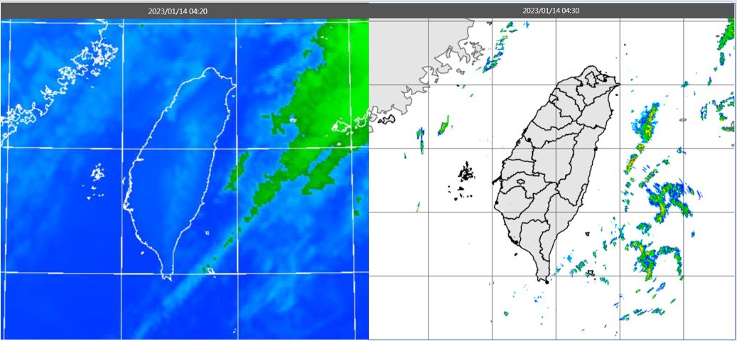 ▲左圖:14日4:20紅外線色調強化雲圖顯示,台灣上空大多晴朗、有零散雲層。右圖:4:30雷達回波合成圖顯示,台灣上空無降水回波。(圖/三立準氣象· 老大洩天機)
