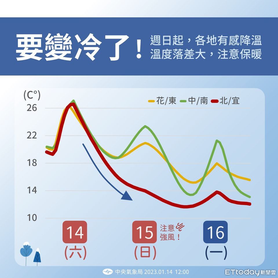 中央氣象局在臉書粉專上表示,降溫預備,將一日變冬天,年前最後的溫暖要結束了,冷空氣即將報到,明(1/15)日北台灣氣溫跳水,一夜入冬,其他地區也會有感降溫,和這幾天的暖熱相比,溫度落差相當大,一定要適時保暖;風力也會明顯變強,尤其在沿海及空曠地區活動,要多加注意強風影響。