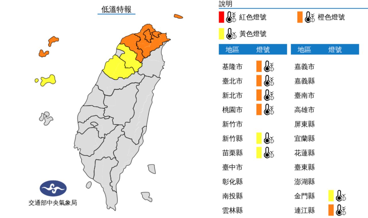 氣象局發布低溫特報並表示,今(15)日大陸冷氣團或強烈大陸冷氣團南下,各地氣溫逐漸下降,今傍晚起至明(16)日基隆、臺北、新北、桃園有持續10度左右或以下氣溫(橙色燈號)發生的機率,連江有持續6度左右氣溫(橙色燈號)發生的機率,新竹、苗栗及金門有10度以下氣溫(黃色燈號)發生的機率,請注意防範。