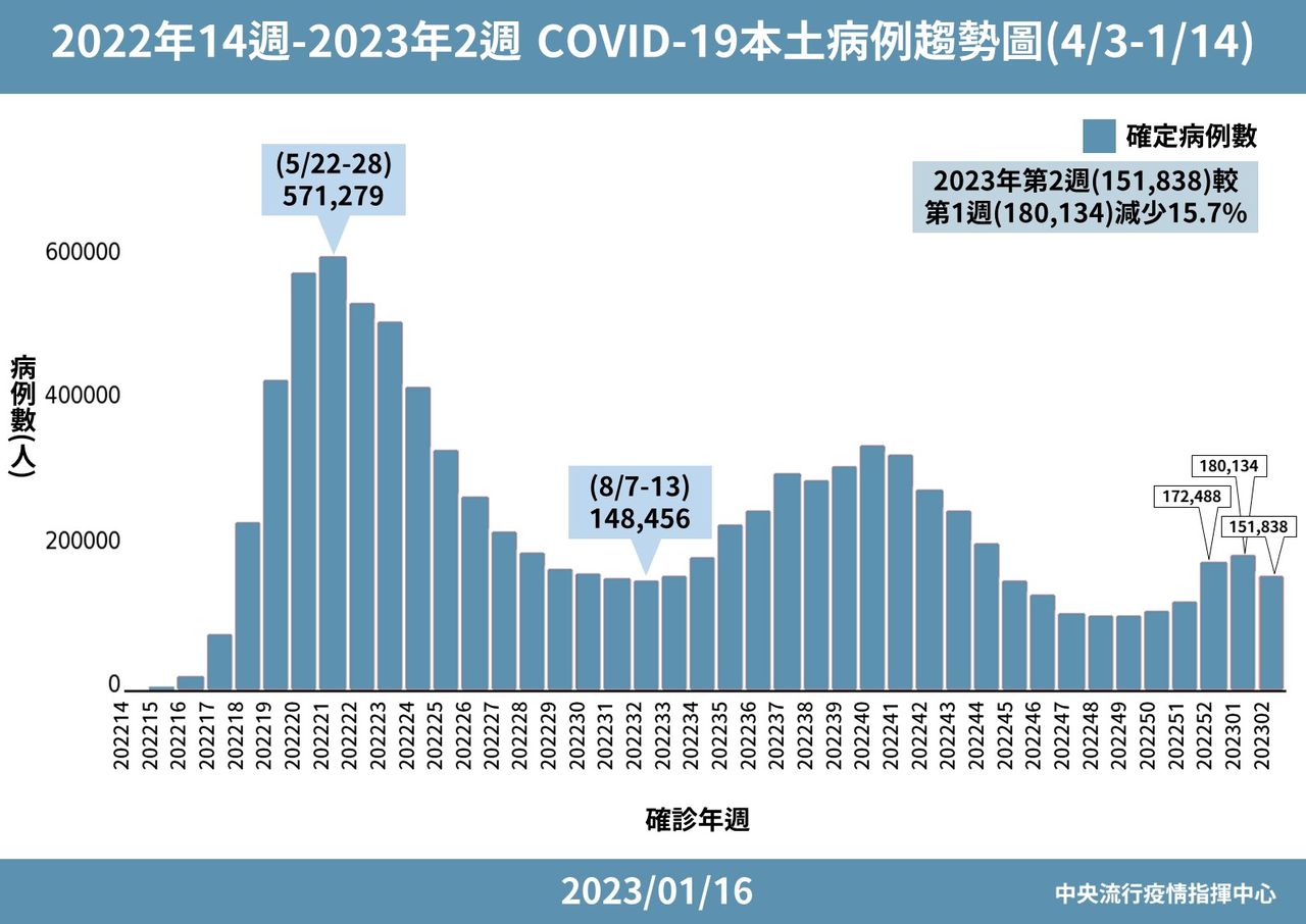 王必勝表示,2023年第二周確診數為15萬1838例,跟第一周18萬0134例相較減少15.7%,下降幅度大,研判第三波疫情已經過了高峰。但他也提到,現在每天確診數還是有1萬至2萬上下,大家還是不能掉以輕心,該打疫苗還是要去打疫苗。