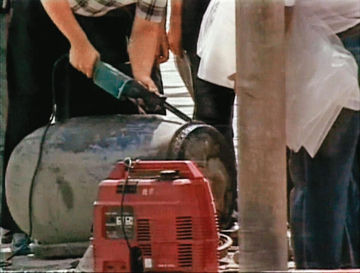 ▼警方鋸開藍色塑膠桶,在裡面發現一具腫脹的屍體。