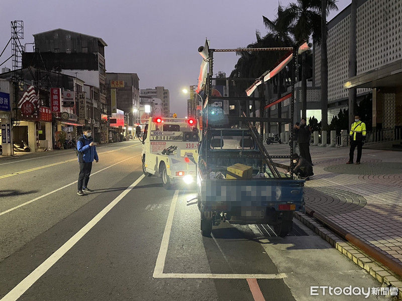 ▲台南市政府交通局在台南市警二分局警方協助下,將台銀前6部抗議車全部拖吊移置。(圖/民眾提供,下同)