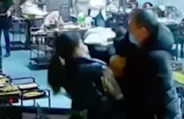 影片畫面顯示,2名女子坐在燒烤店吃飯,一男子在旁跟她們說著話,突然該男子拿著刀將其中一女孩鎖喉,另一女子嚇得趕忙跑開,在一旁捂著嘴求救。這時老闆娘衝上前將男子的拿刀手控制住,老闆見狀也快速趕來,最後兩夫妻合力將男子制伏。