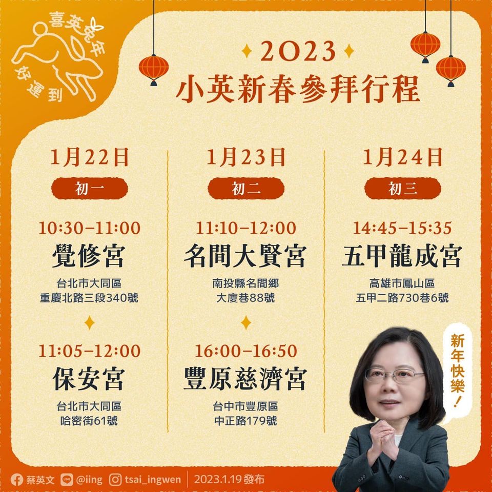 蔡英文初三(24日)發福袋的行程,則是於下午2時45分,前往高雄市鳳山區的五甲龍成宮。