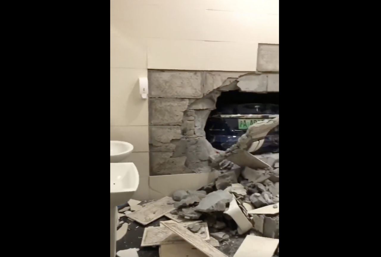 這支網友爆料的影片僅短短10秒左右,並未講明發生時間,影片從男廁外一路拍到男廁內,一開始看似正常,鏡頭帶到廁所內才發現,內部空間已經一片狼籍,地面充斥磚瓦碎塊,不僅看不出小便斗的擺放位置,牆上還出現一個巨型大洞,一輛藍色掛有「滬牌」的特斯拉停放在洞口,疑為失控後退造成巨大撞擊力影響所致。