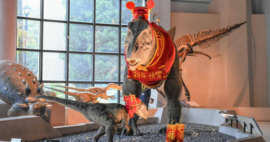 國立自然科學博物館分享了館內超人氣明星暴龍母子換上新年衣服的照片,可以看到暴龍媽媽身上穿了件喜氣的紅色背心,和小恐龍都帶上了米奇彈簧帽扇,讓不少人直呼可愛,不過也有人開玩笑留言「恐龍馬麻和寶寶真的有答應你們每次的變裝嗎?而且牠們都下半身失蹤,我兒子一直覺得恐龍馬麻是辣妹呢!」