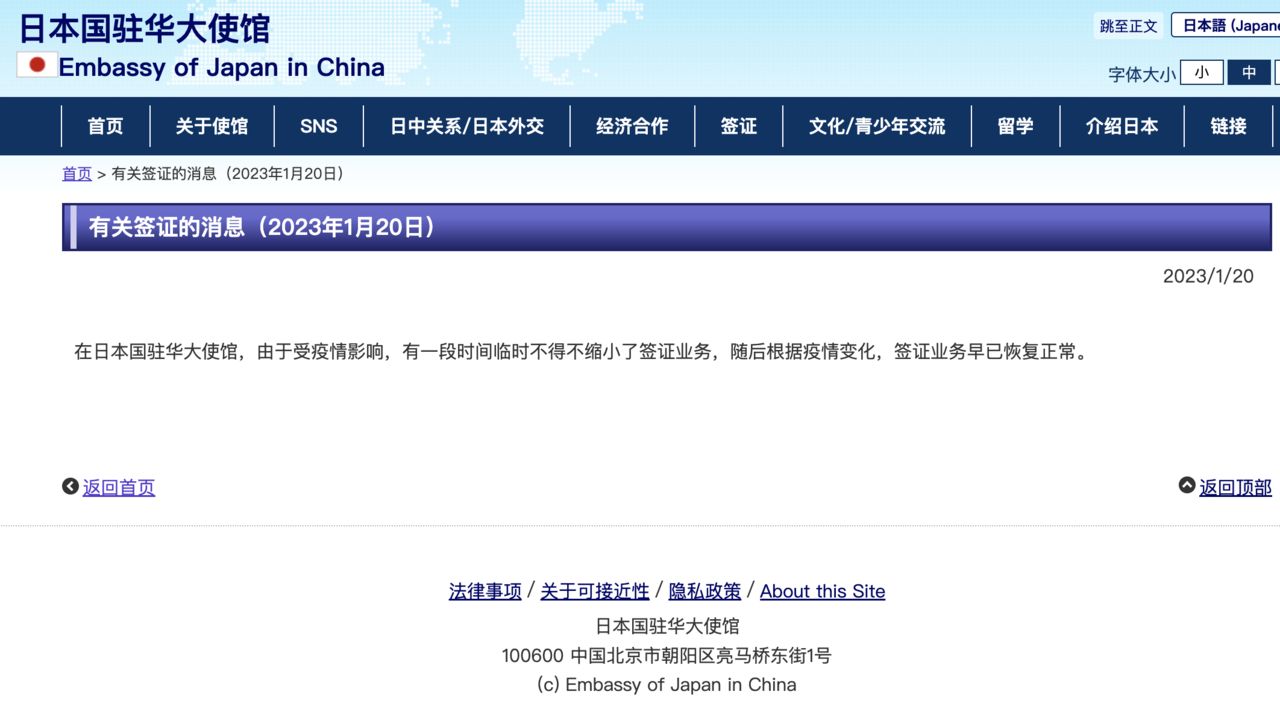 日本駐中國大陸大使館20日在官網發出聲明表示,「在日本國駐華大使館,由於受疫情影響,有一段時間臨時不得不縮小了簽證業務,隨後根據疫情變化,簽證業務早已恢復正常。」