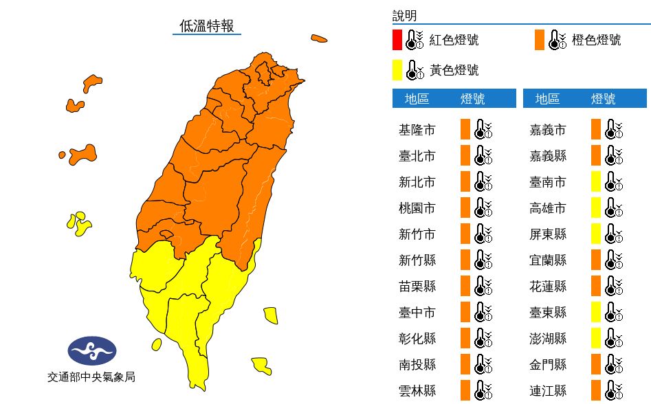 從燈號警示可見,嘉義以北地區皆屬橙色燈號(平地最低氣溫攝氏6度以下,或平地氣溫10度以下且連續24小時平地氣溫攝氏12度以下),僅台南、高雄、屏東等南台灣縣市及澎湖是黃色燈號(平地最低氣溫攝氏10度以下)。
