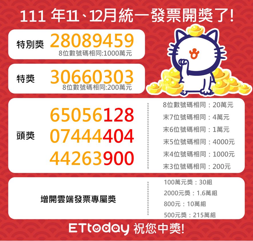 大年初四迎財神,11、12月統一發票也正好在今天開獎啦!本期(111年11-12月)千萬特別獎號碼是28089459,快看看手上的發票,也許財神爺已經降臨你家門口,準備要送上大禮囉!
