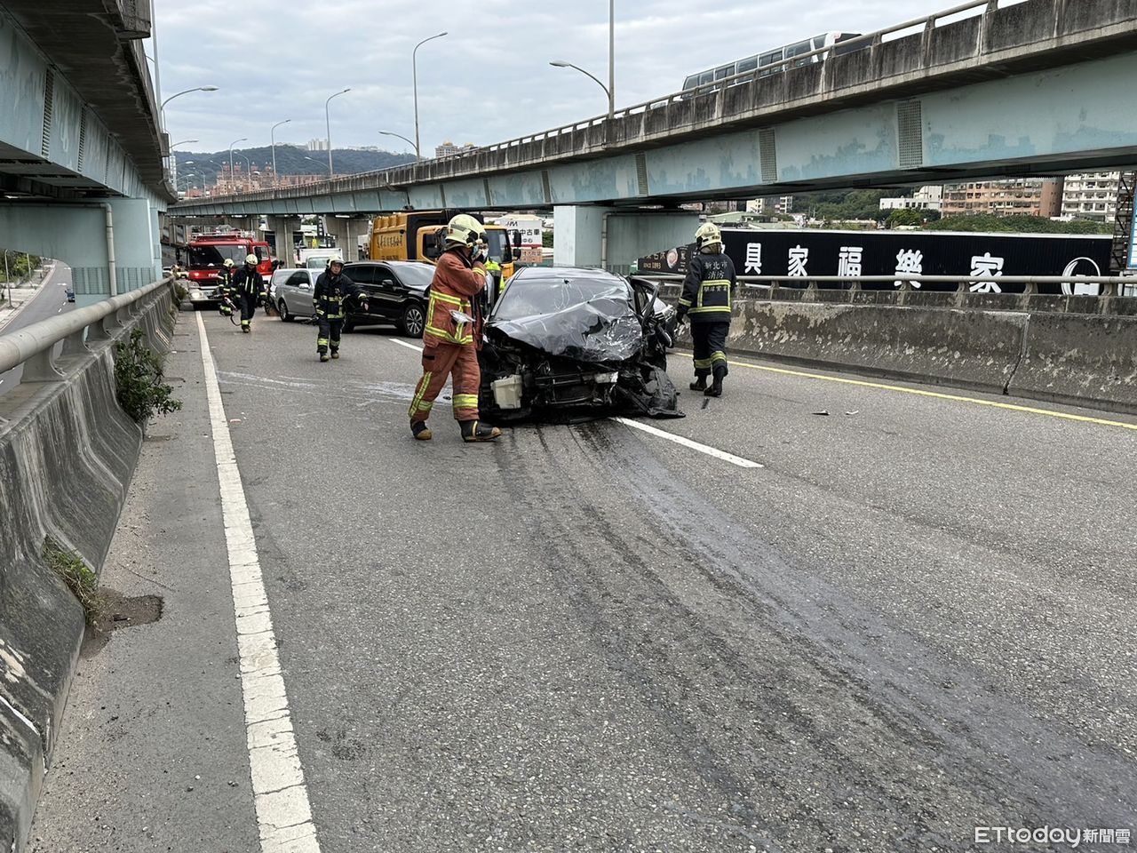 警方初步調查,李男當時駕駛黑色轎車載著1男1女,沿著新五路二段逆向駛上高架匝道,與黃男駕駛的自小客猛力對撞,2車車頭嚴重爛毀、面目全非,首當其衝的李、黃2人傷勢嚴重,警消到場協助脫困時,李已經意識模糊;而黃男則是沒有呼吸心跳,2人雙雙送醫搶救,但黃男稍早因傷勢過重,宣告不治死亡。另乘客1男1女則受到輕傷,後續也送往醫院治療。