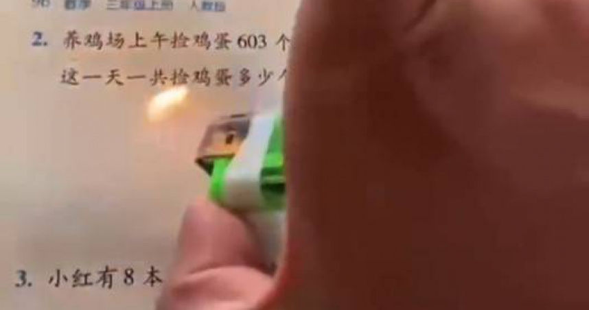 根據微博《農民頻道》報導,事情發生在1月30日,哥哥在開學前一天惡作劇,拿打火機在弟弟的作業上燒,只見火苗掠過的地方,藍色原子筆的筆跡立刻消失,變回還沒寫作業前的模樣。