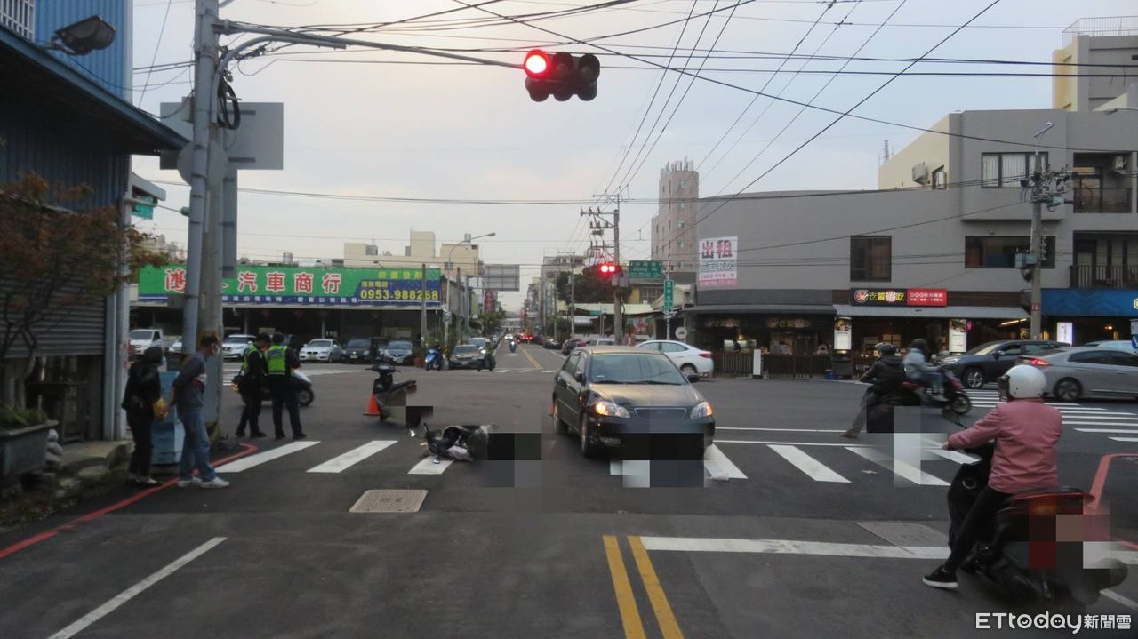 陳男駕駛自小客車沿三民街往公園路方向直行,在路口連續撞倒2輛機車,警方到場發現,59歲的蔡女右腳、右腰擦挫傷,另輛機車上雙載的2名男子則是未見人影,機車還留在現場。