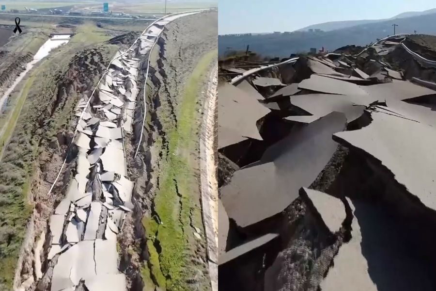 土耳其《每日晨報》12日公開一段空拍畫面,可見這條經阿德亞曼(Adıyaman)、尚勒烏爾法(Şanlıurfa)及加濟安泰普(Gaziantep)的公路通往科塞利村(Köseli)路段震後慘不忍睹,路面如餅乾一般碎裂解體,一塊塊碎片相互交錯、有的突起有的塌陷,就連兩旁邊坡都震出長長裂縫,原先的綠地也因土石外露變成黃褐色。
