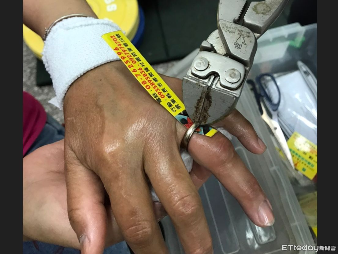 ▲消防人員利用斜口鉗破壞,取出戒指,解除女子疼痛 。(圖/民眾提供,下同)
