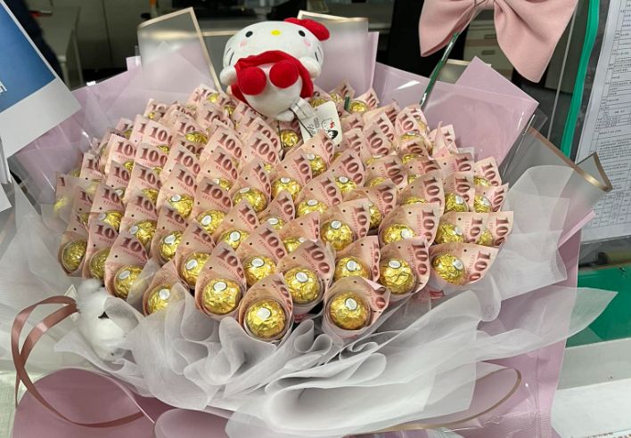 照片顯示,該花束為粉紅色、白色包裝,內部有至少80隻百鈔包覆的金莎巧克力,上方則有一隻Hello Kitty娃娃,以及一個巨大的粉紅色領結。