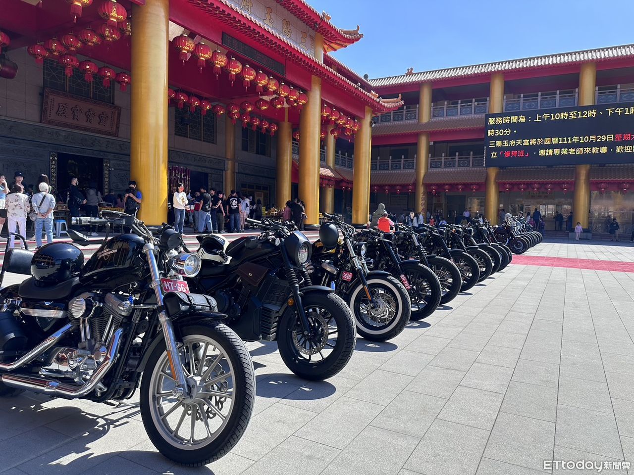 ▲台中惡人騎士車隊21名成員12日前往龍井三陽玉府天宮淨車,大批重機緩緩騎入馬上吸引香客目光。(圖/IG/harleyoutrage_2021/OUTRAGE 惡人騎士授權,下同)