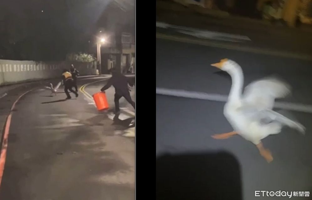 新北市新店區警方15日凌晨2點多接獲民眾報案,稱在安康路二段與安忠路口看到一鴨一鵝在馬路上閒晃,3名警力到場後開始找容器捕捉,鴨、鵝快速揮動翅膀奔跑並閃避警方「追緝」,畫面相當逗趣,員警自己都笑出來。