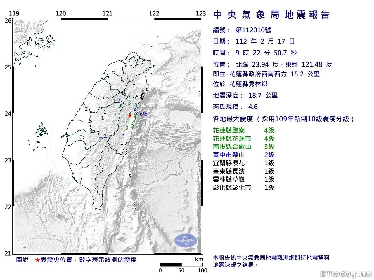 今(17)日9點22分花蓮地區附近發生芮氏規模4.6有感地震,地震深度18.7公里,最大震度4級出現在花蓮縣。