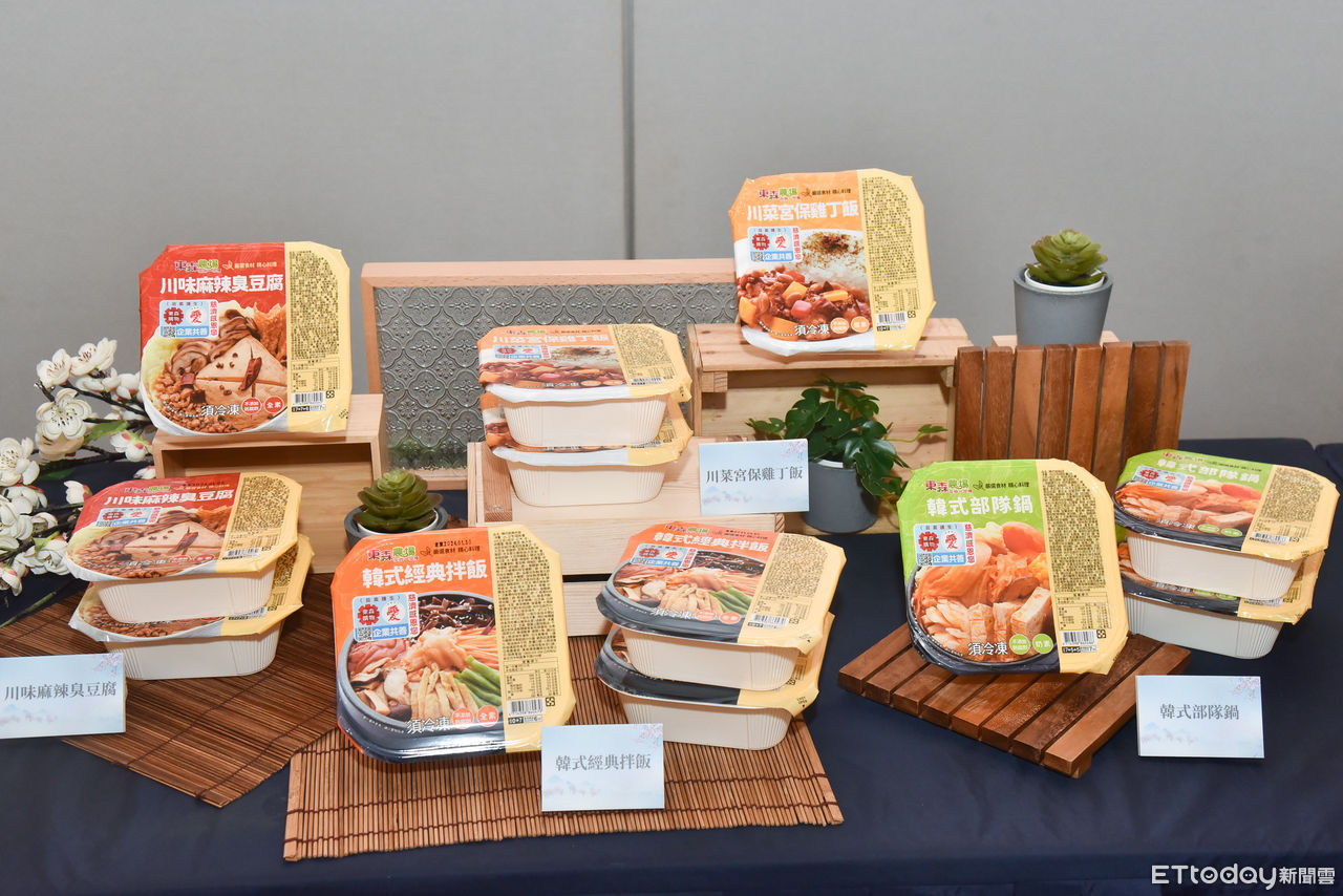 ▲「東森農場天地糧莘蔬食組」餐盒,包含川菜宮保雞丁飯、韓式經典拌飯、韓式部隊鍋、麻辣臭豆腐共四種口味,皆為素食商品。(圖/記者李毓康攝)