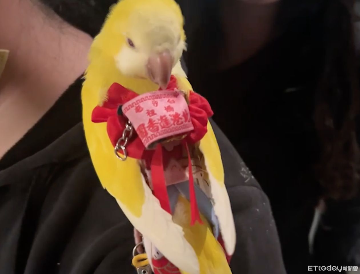黃色的蓬蓬羽毛加上咪咪眼的神情,這名叫妞妞的和尚鸚鵡看起來相當溫馴,19歲的飼主林小姐表示,已經參加過多次白沙屯媽祖進香活動,而妞妞則是第一次參加,因為每隻鳥的個性不一樣,妞妞特別溫馴、穩定,即便旁邊有突然的鞭炮聲也不太會受到驚嚇,所以放心帶他出門,他身上帶的迷你小臂章是善心人士沿路發的結緣品,幫他別上之後,好像真的成為「鳥香客」。