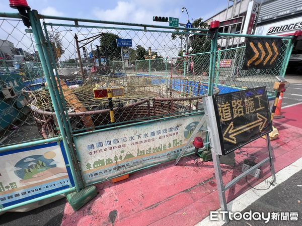 ▲桃園市桃園區國際路二段、文中路口處施工,昨天清晨發生「龍舟天菜」陳俞安誤闖摔落14米深坑洞意外,工地現場已在坑洞上加上防護網等安全維護。(圖/記者邱中岳攝)