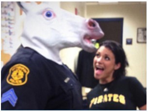 美國一名A片女星最近在匹茲堡海盜隊主場比賽期間,在看台上戴著獨角獸的面具狂舞,她不服制止還飆髒話,結果被警方帶回,沒想到警局裡竟有員警戴上她的觸角獸面具,豔星則在旁吐舌作怪,照片被PO上推特後引發熱議。