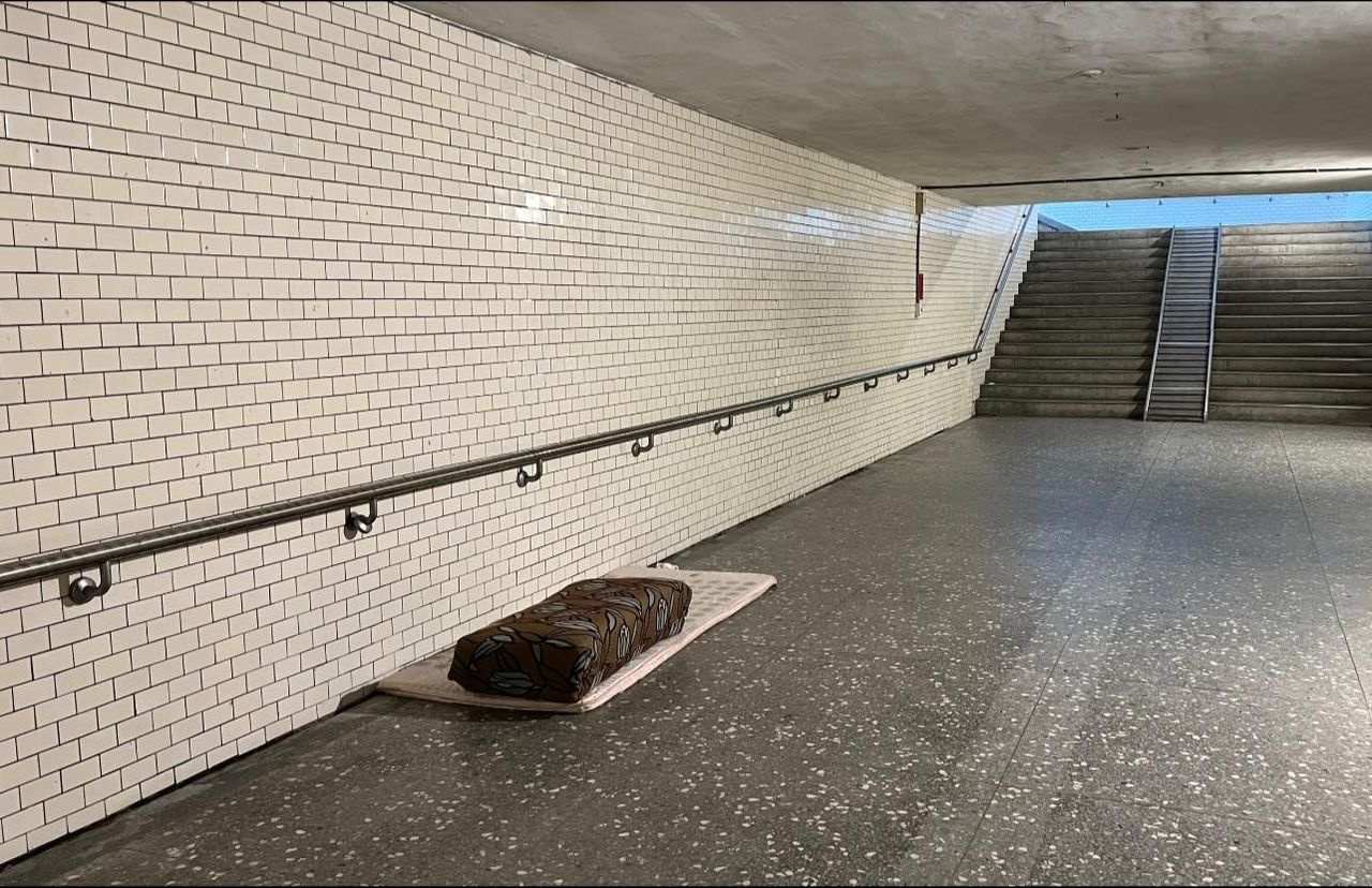 原PO在臉書社團「路上觀察學院」分享照片,照片拍攝地點在新北市樹林區保安街行人地下道,照片中街友離開之前,把過夜用的床墊及棉被整理的非常整齊,宛如當兵起床必須摺出的「豆腐被」一般,讓他自嘆不如。