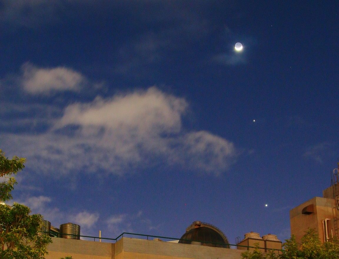 據台北市立天文科學教育館介紹,2月22、23日兩天接連發生金星合月、木星合月的精彩天象,22日傍晚的金星合月,夜空中最亮的金星與眉月相距不到兩度,次亮的木星在其上方不遠處,而今晚月球移至木星上方,此時一彎眉月、木星及金星相距各約6度,在西方天空整齊排成一列。