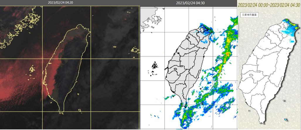 ▲左圖:24日4:20真實色雲圖顯示,西半部有低雲或霧。中圖:4:30雷達回波合成圖顯示,大台北及東半部海面有降水回波。右圖:4:30累積雨量圖顯示,北海岸、大台北東側及宜蘭降雨較明顯,桃園零星飄雨。(圖/翻攝三立準氣象· 老大洩天機)