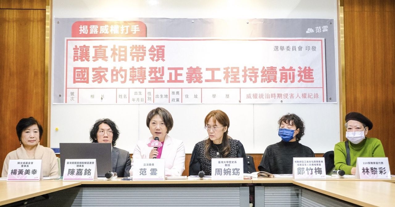 立委范雲24日舉辦「揭露威權打手:真相才能帶領國家轉型正義工程持續前進」記者會,她提出2點呼籲,包含:立院應儘速通過修改選罷法,讓選舉公報揭露威權統治時期加害人、共犯紀錄,政治檔案條例修法也應儘速通過,有破九成政治檔案都被遮蔽,不應讓受害者家屬苦等真相。