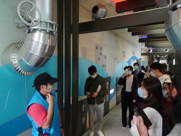 ▲導覽志工為元智學生解說老街溪河川教育中心的礫間。(圖/元智提供)
