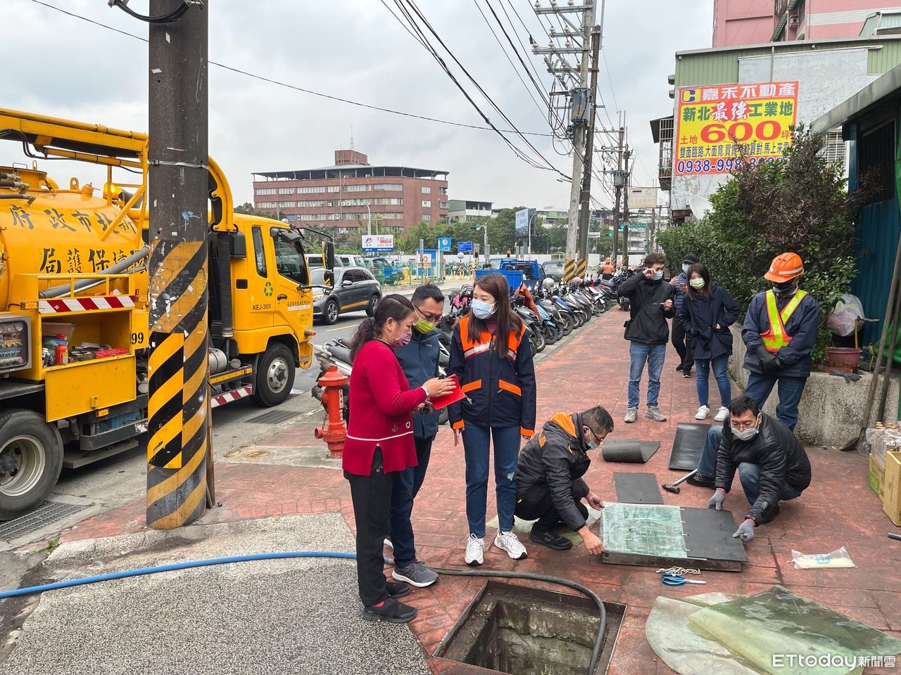 ▲新莊美式大賣場周圍持續發臭4天,市府出動大批人馬處理,左二為新莊瓊林里長吳佳擇。(圖/民眾提供)
