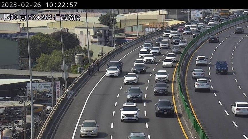 ▲今早國10東向5.1公里處發生小貨車及小客車追撞事故,造成後方車流回堵3公里。(圖/高公局)