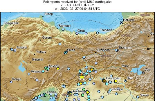 土耳其當地27日中午12時4分發生規模5.2極淺層地震,依據歐洲地中海地震中心測得數據,這起地震震央位在城市馬拉蒂亞(Malatya)南方約11公里處,震源深度僅5公里。