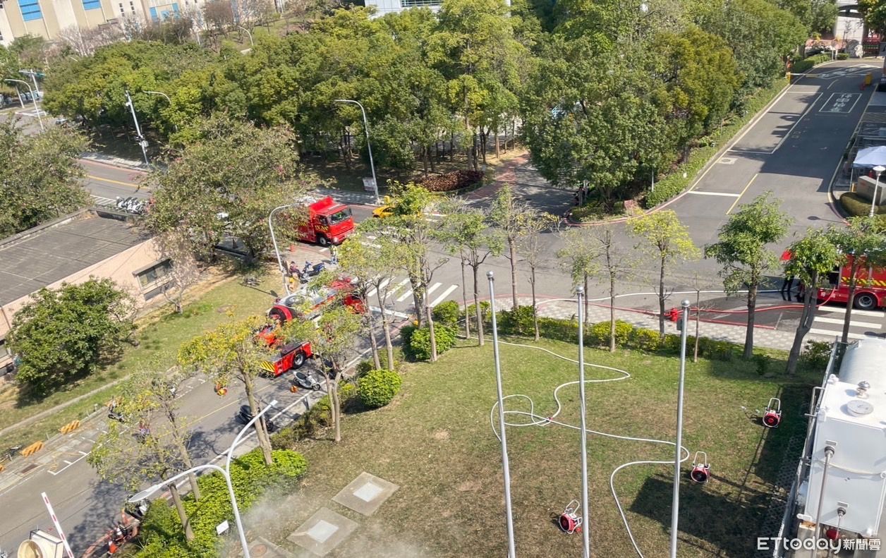 ▲竹科聯亞28日上午發生水蒸氣外洩壟罩道路,消防隊連忙出動機具排除狀況。(圖/記者陳凱力翻攝)