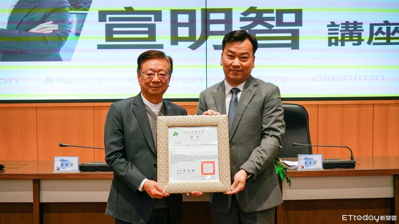 崑山科技大學持續邀請業界大師蒞校授課,一流師資讓學生從產業先進學習並汲取經驗,1日禮聘公信電子董事長暨聯電榮譽副董宣明智擔任榮譽講座教授,由李天祥校長親頒證書,宣明智董事長也以「亂世的希望-對有志青年的期許」為題,向在座師生分享經驗,未來則針對南部電動車技術研發相關經驗,不定期蒞校指導。