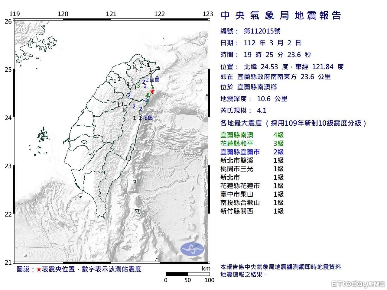 宜蘭2日晚間7時25分發生規模4.1地震,震央位於宜蘭縣政府南南東方23.6公里、位於宜蘭縣南澳鄉,深度10.6公里,最大震度4級。