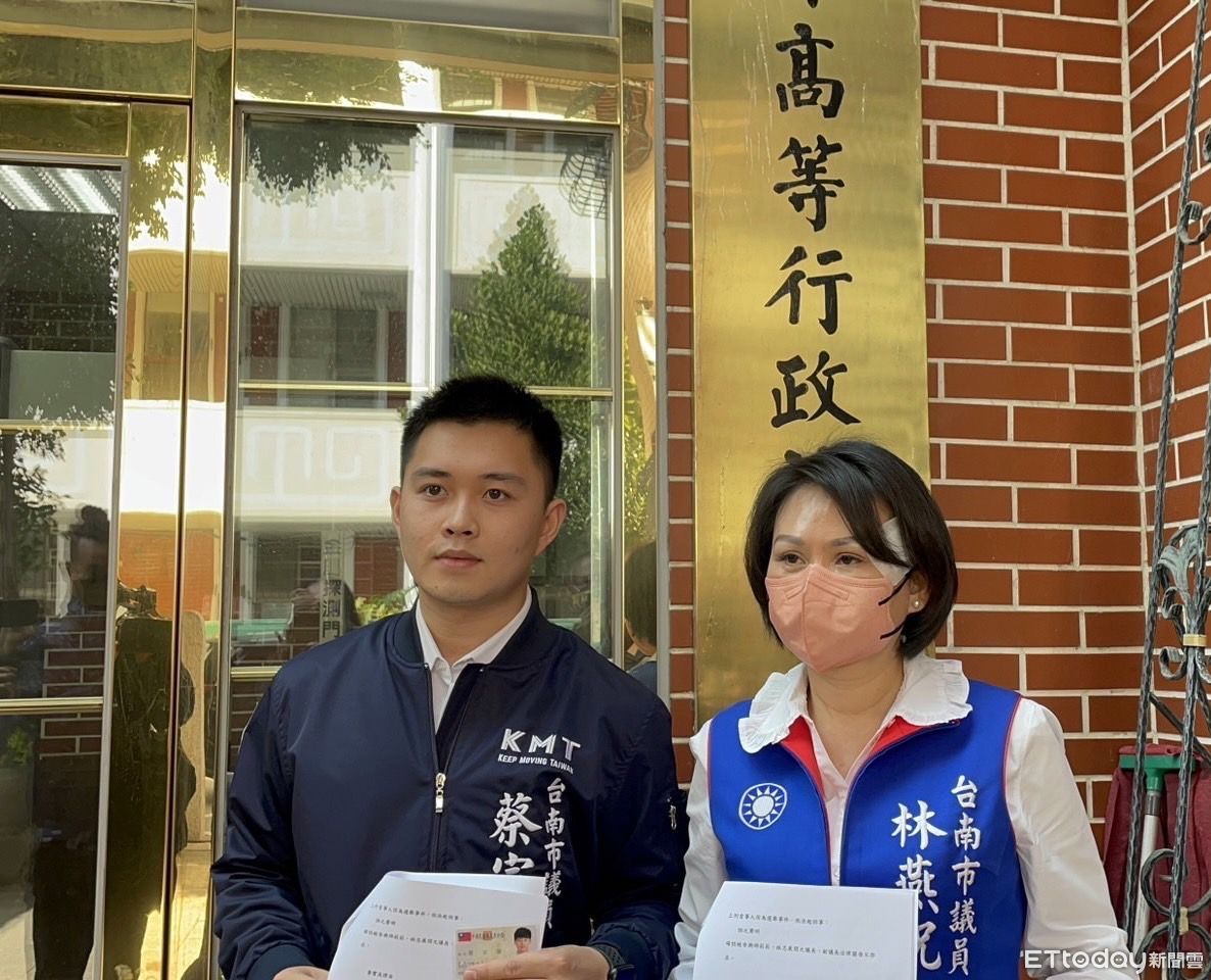 ▲台南市議員蔡宗豪3日也在市議員林燕祝陪同下,特地前往高雄高等行政法院台南庭,按鈴申告台南市正副議長邱、林2人當選無效。(圖/記者林悅翻攝,下同)