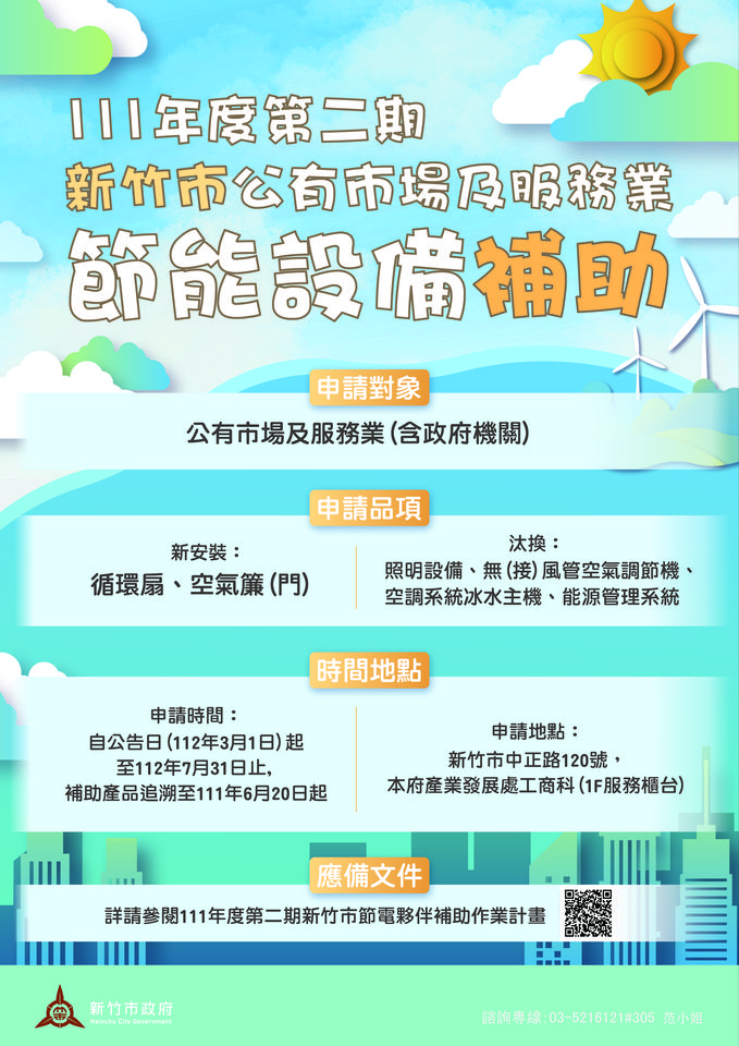 因補助額度有限,產發處將於112年3月9日及3月14日辦理「111年度第二期新竹市節電夥伴補助計畫宣導說明會」2場次,歡迎本市轄內公有市場及服務業(含政府機關)踴躍報名參加,報名網址:(https://ppt.cc/fJHz7x)。民眾若有相關疑問歡迎直接洽詢:03-5216121#305、03-5910008#44。