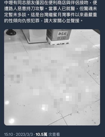 有網友在推特推文指稱,「中壢有同志朋友僅因在便利商店與伴侶接吻,便遭路人惡意持刀攻擊,當事人已就醫,但驚魂未定暫未多談,這是台灣繼蜜月灣事件以來最嚴重的性傾向仇恨犯罪;當事人林姓男子也在臉書透露,「第一次跟同性伴侶在便利商店門口接吻就被拿刀砍傷成這樣,但我跟老公並沒有錯,從對方口中說出同性戀很噁心,讓他很灰心。」