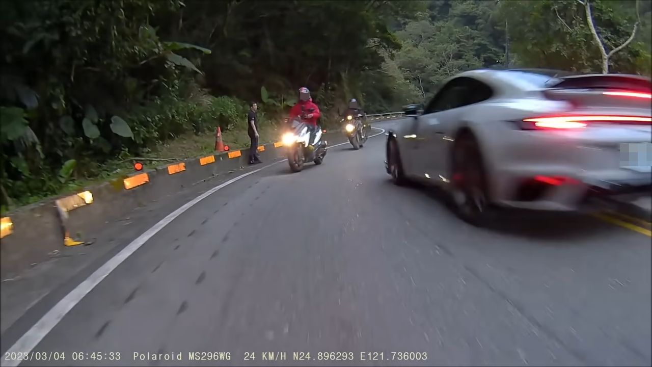 其中,一輛黑色保時捷更是整台車開到對向車道,讓騎士嚇到停車並快速騎到山壁旁躲避,深怕自己被撞到。原PO表示,「開超跑的猴子還是猴子。根本就是蓄意殺人了,還好我跟我朋友有防衛意識看到一群衝下來就靠邊走了。」