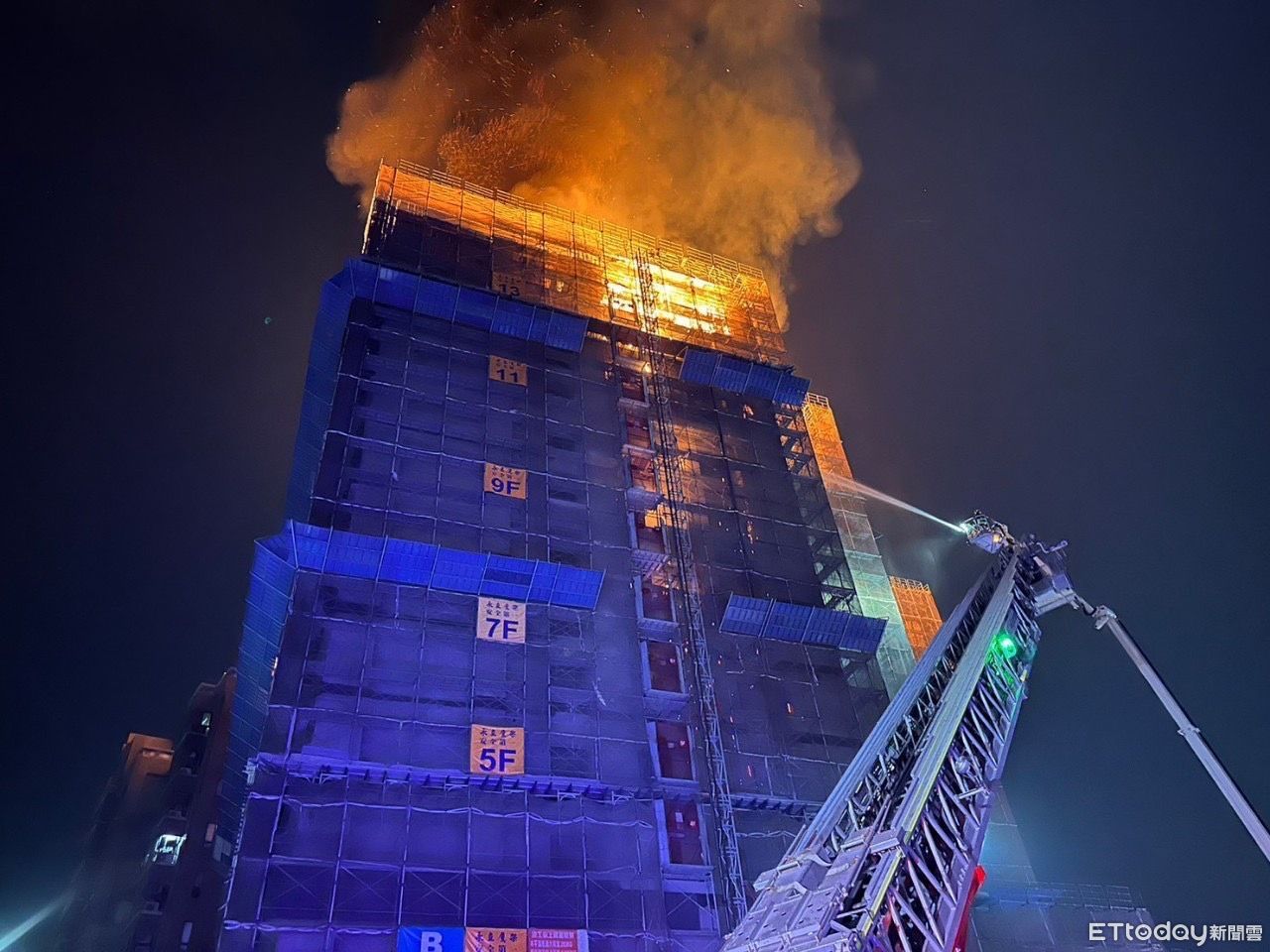 ▲台中一棟興建中的大樓的14樓大火,警消爬上樓花了1個半小時撲滅。(圖/民眾提供,下同)