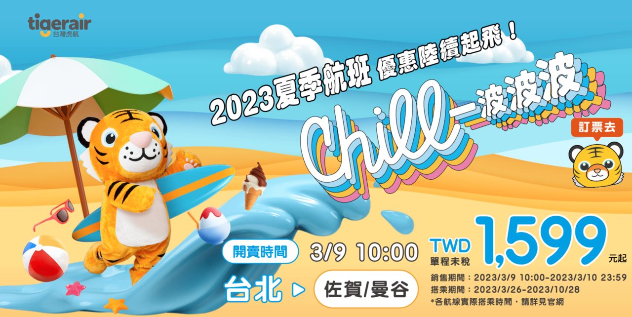 Just.崩潰.ME在臉書發文指出,台灣虎航2023夏季航班第六波將於今日10時起至明(10)日23時59分開賣,優惠搭乘期間分別為佐賀4/2到10/28,單程未稅1599元起;曼谷3/26到10/28,單程未稅1599元起。