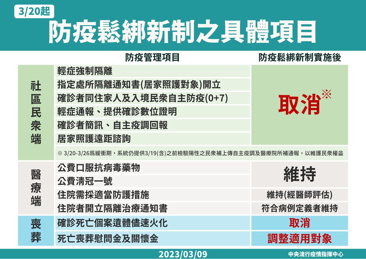 3月20日新制上路,社區民眾端與喪葬相關總計有7項措施取消,除「輕症強制隔離」取消,包含「指定處所隔離通知書(居家照護對象)開立」、「確診者同住家人及入境民象自主防疫(0+7)」、「輕症通報丶提供確診數位證明」、「確診者簡訊、自主疫調回報」、「居家照護遠距諮詢」等措施也一併取消,另喪葬方面「確診個案儘速火化」也取消。