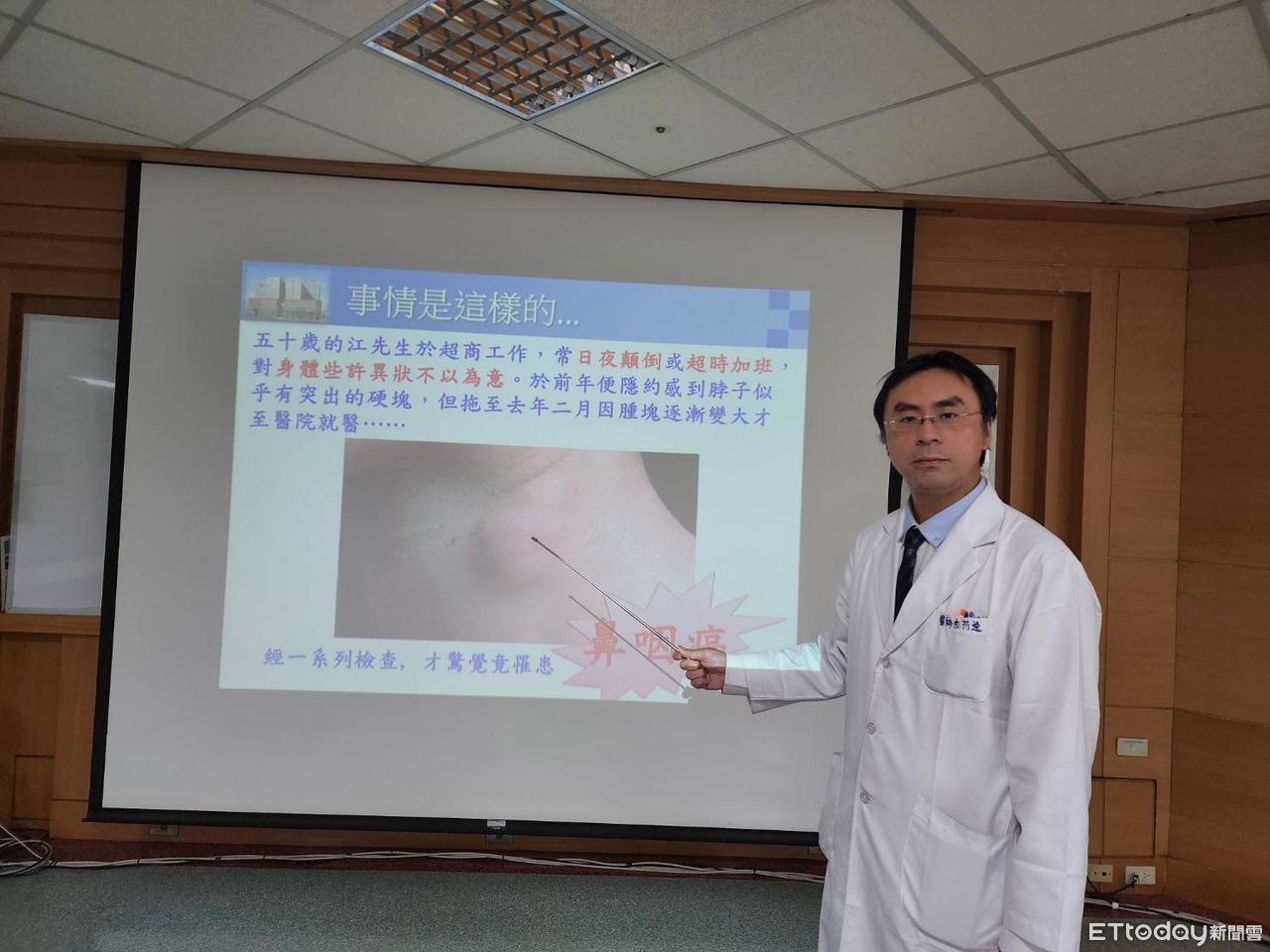 一名50歲超商店員不菸不酒,但上大夜班生活作息日夜顛倒、常超時工作。日前聞不太到味道,卻不以為意,日前發現脖子出現腫塊,猶如雞蛋大小,還越來越來大,趕緊前往醫院就診,一檢查竟是鼻咽癌四期,所幸接受2個月放療及化療,追蹤一年,目前工作、生活皆恢復正常。