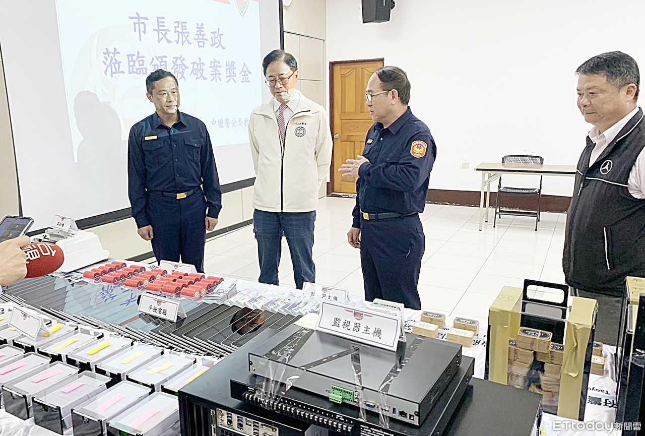 ▲桃園市長張善政今天下午視察中壢警分局,警方起出大批現金、籌碼、監視器鏡頭、點鈔機等證物。(圖/記者沈繼昌翻攝)