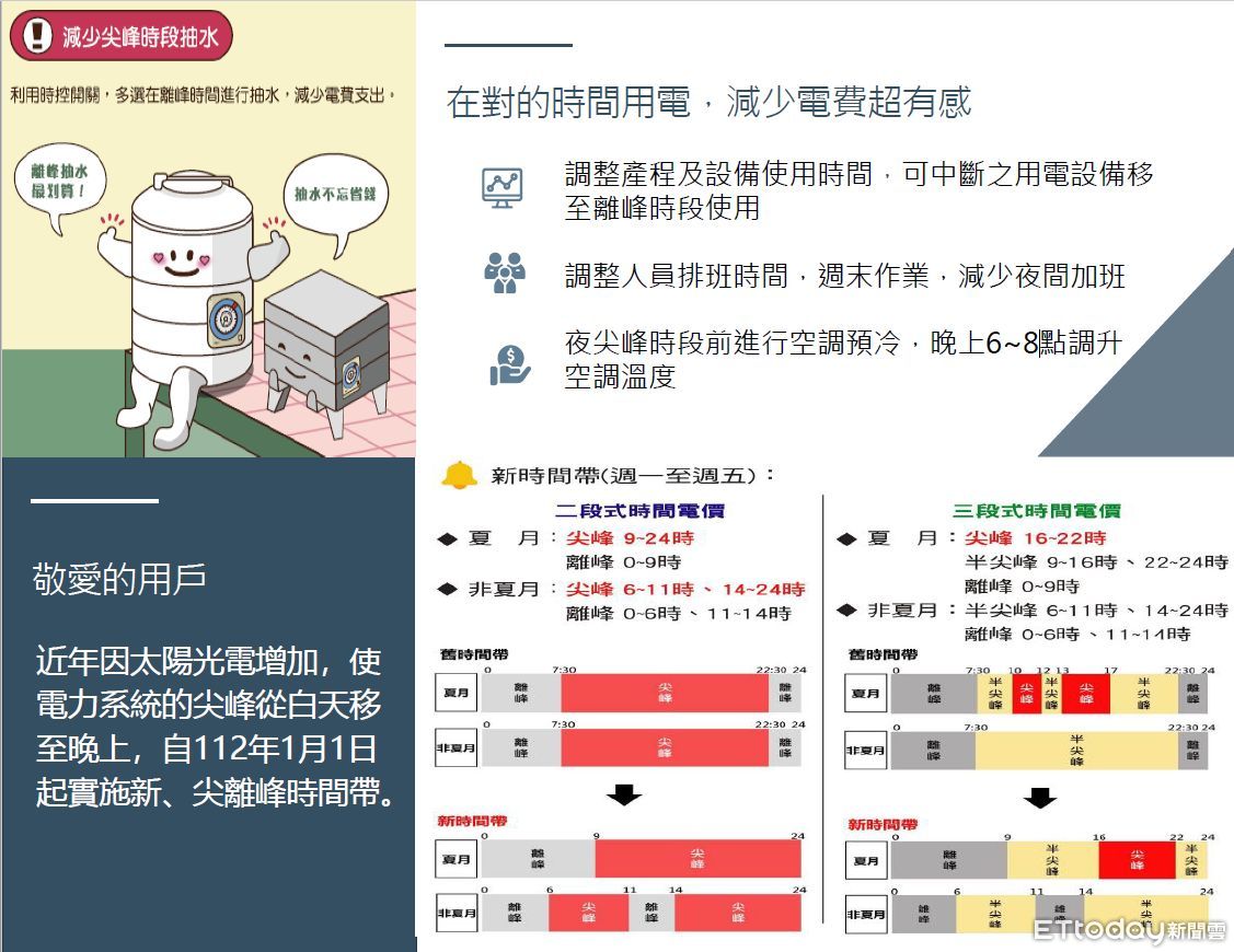 嘉義區處處長許墩貴提醒,以往的尖峰時段是落在下午1~2點,因應政府再生能源政策,太陽能生力軍大量併網下,目前天氣好時,中午太陽光電發電佔比可高達20%,隨著太陽下山,發電佔比也越來越低,因此尖峰時段移至了傍晚6~8點,形成了「夜尖峰」。112年開始高壓用戶的夏月期間調整自5月16日至10月15日,由原來4個月擴大為5個月,請各位高壓用戶要留意。