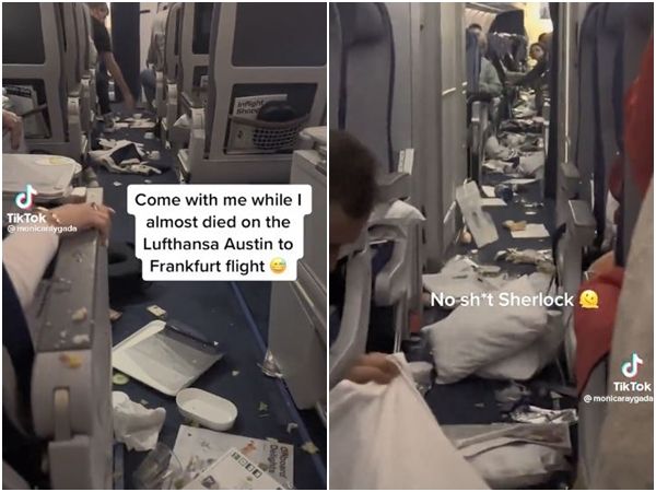 ▲漢莎航空班機遇亂流,如自由落體般高空下墜數千英尺,枕頭餐盤亂飛。(圖/翻攝自推特@notcapnamerica)