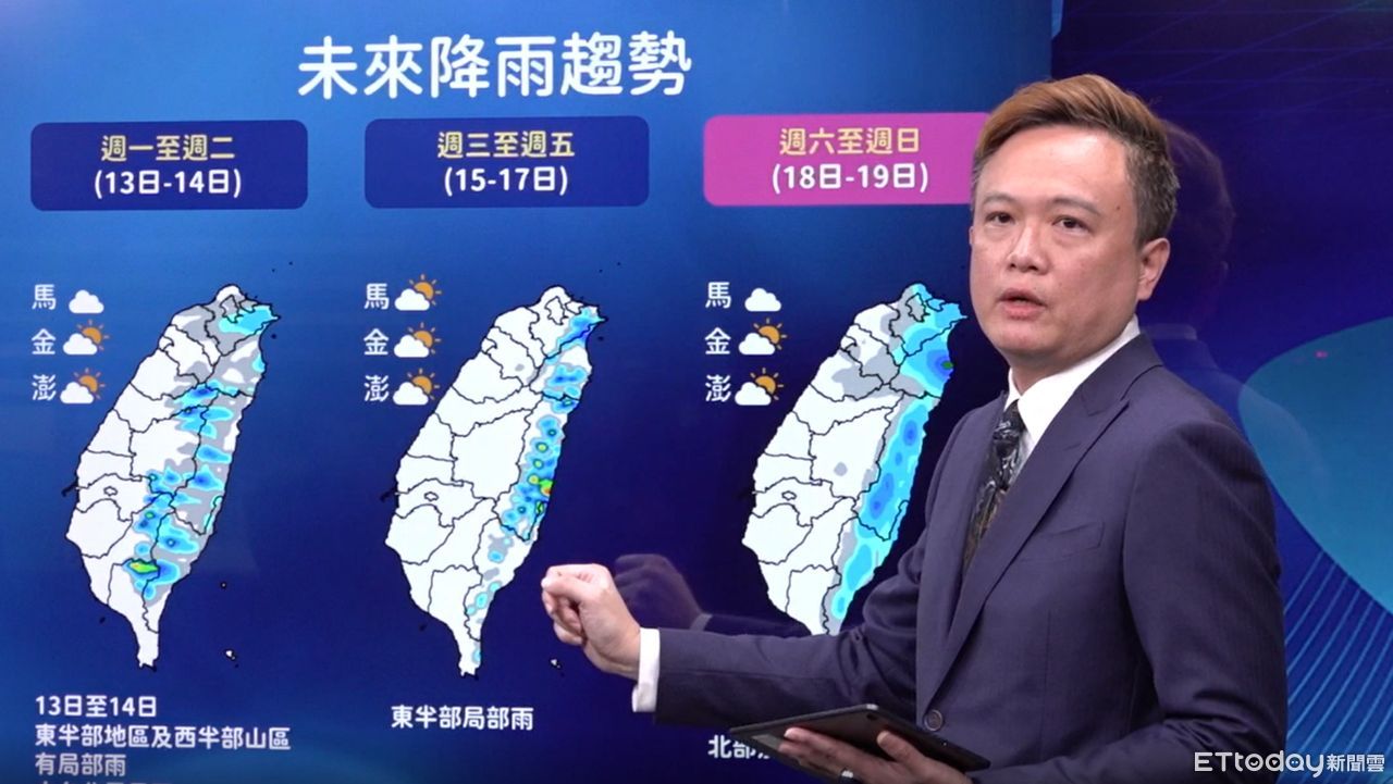 今明兩天(3/13~3/14)東半部、南部山區有局部雨,大台北地區有零星降雨,中部、南部偶爾可看到陽光;隨今天下半天,華南有水氣由西向東到台灣上空,西半部山區下雨機率偏高,今下半天到明天清晨西半部山區降雨相對明顯。周三到周五(3/15~3/17)降雨緩和,東半部有局部雨;周六(3/18)東北風來到,迎風面北部、東半部降雨機率提高。